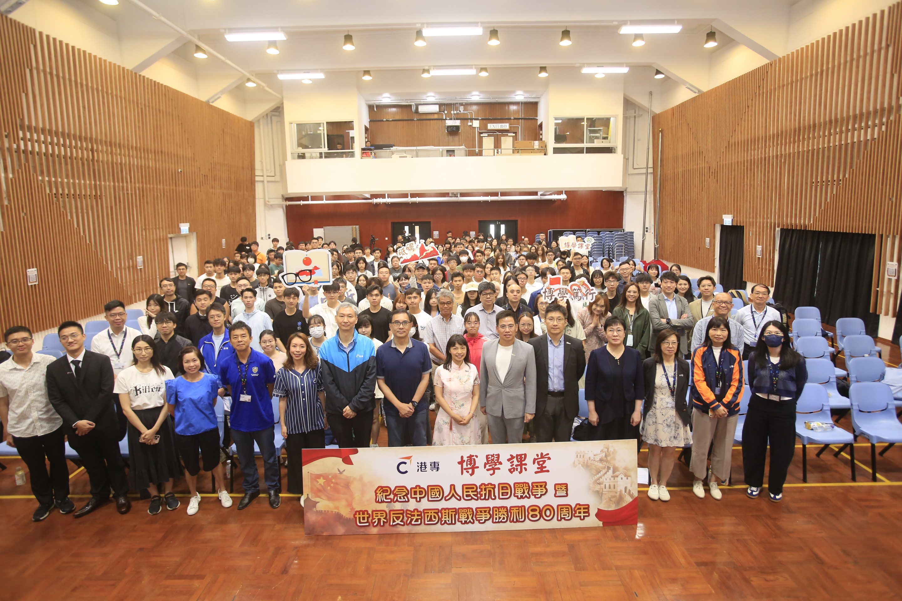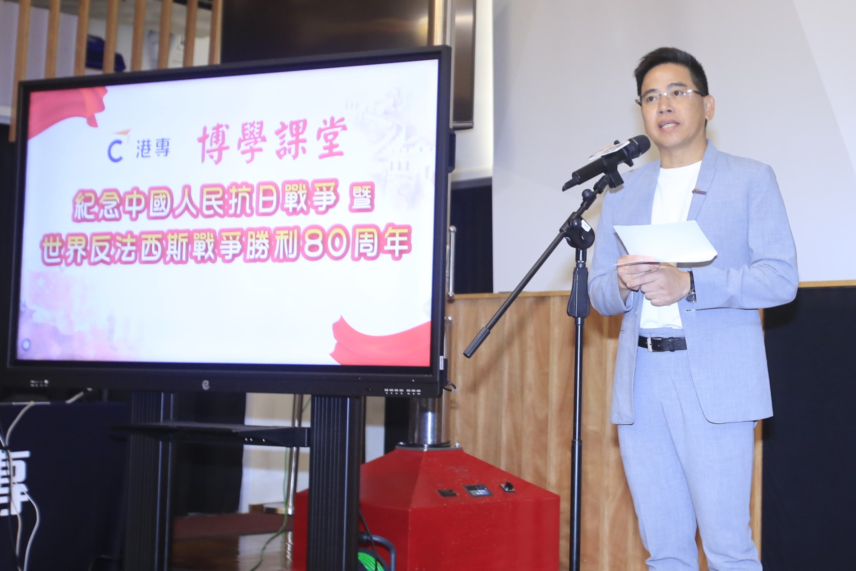 (2025年9月3日,香港) 為紀念中國人民抗日戰爭暨世界反法西斯戰爭勝利80周年,港專學院及香港專業進修學校(「港專」)今日於賽馬會本科校園綜藝館舉辦了一場別開生面的「博學課堂」紀念活動。活動透過觀看抗戰勝利80周年閱兵現場直播,並由本校「軍事迷」學生與升旗隊義務導師即場旁述,與在場近200名師生共同銘記歷史、緬懷先烈、珍愛和平、開創未來。
