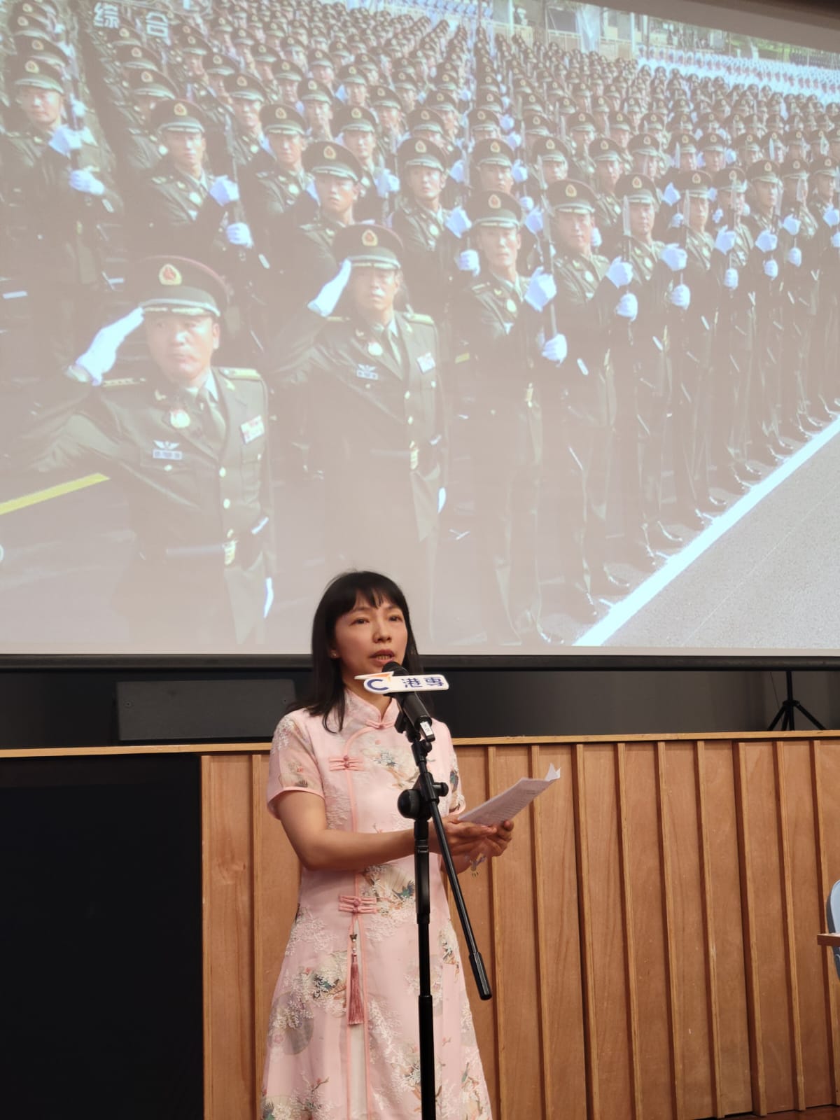 港專副校長李慧慈教授致辭時指出:「歷史是最好的教科書。80年前抗戰勝利,無數先烈用生命和鮮血換來了勝利與和平。銘記這段關乎民族存亡、國家命運的歷史,是要讓我們更加珍愛今日我們自己土地上的和平,也關乎我們每一個人的身份認同與未來責任。今天的活動,是一次重要的愛國主義教育實踐,融合了歷史教育、國防科普與現場互動,打破傳統課堂的界限,加深大家的愛國情懷,並立志報國。而今日報效國家可以不直接上軍事戰場,而在各行各業以及生活日常體現整體國家安全觀,共同維護國家安全。」