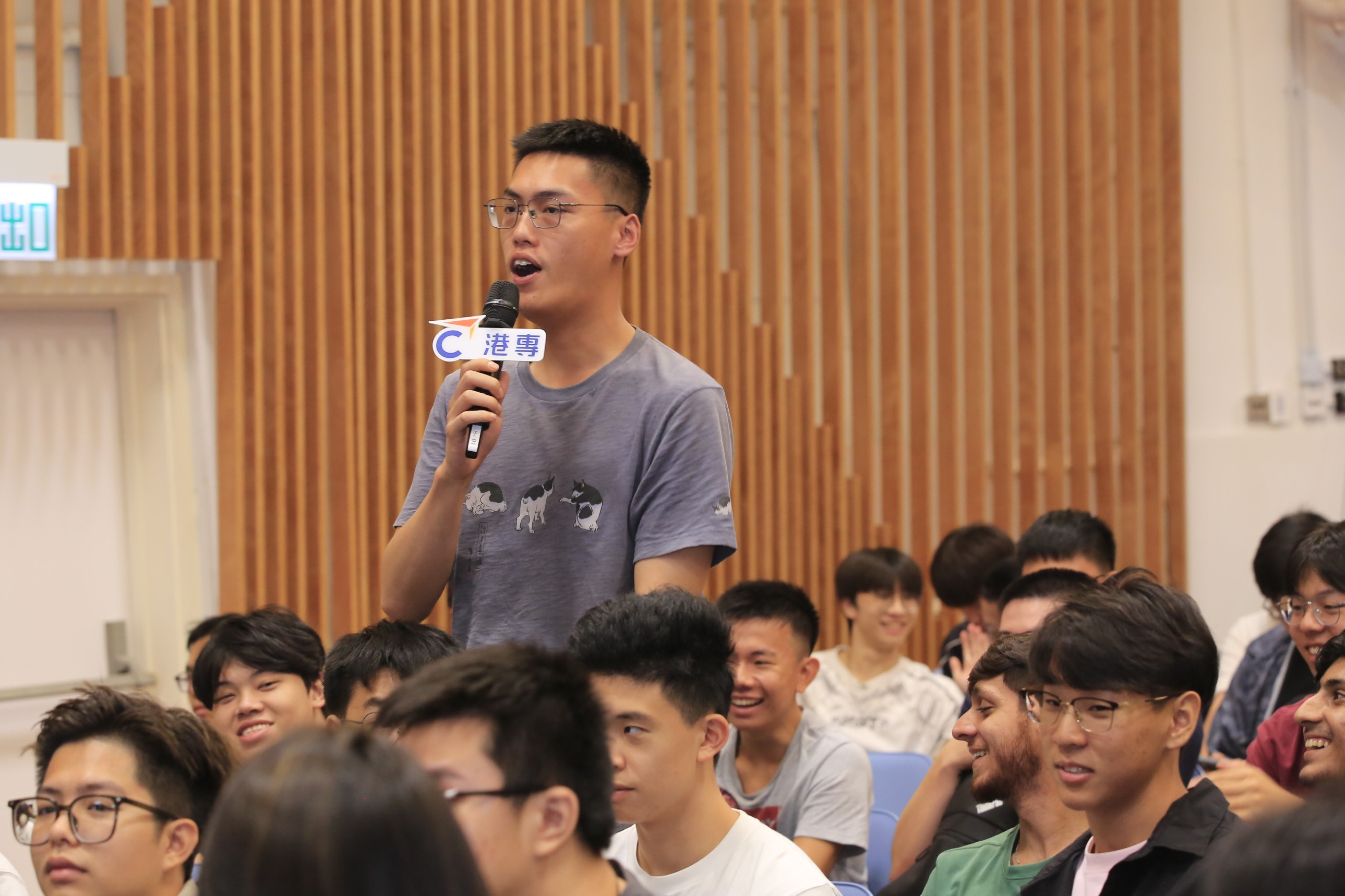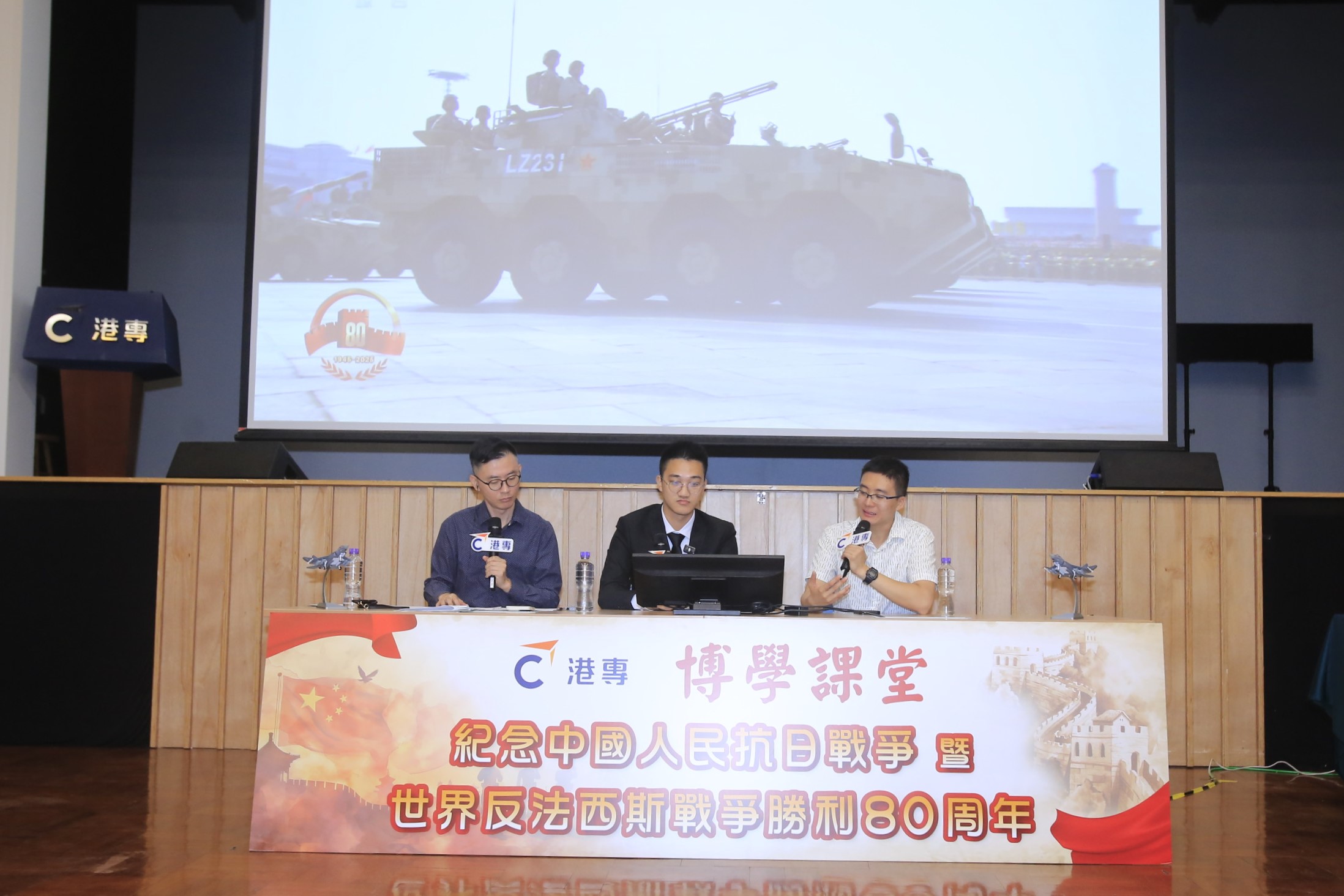 本次活動由剛剛畢業於應用教育文憑(入境與海關)課程的學生帥斌華,聯同港專升旗隊義務導師文冠皓,共同為直播畫面提供生動而充滿知識性的講解。他們從軍事裝備的發展、國防現代化的歷程,分享到自身對國家強大的深刻感受,並與現場同學進行問答互動,場面熱烈。此活動不僅展現了兩位港專導師及學生講者對國家軍事發展的關注和認識,更將他們對抗戰歷史的反思真切地傳遞給在場每一位師生。