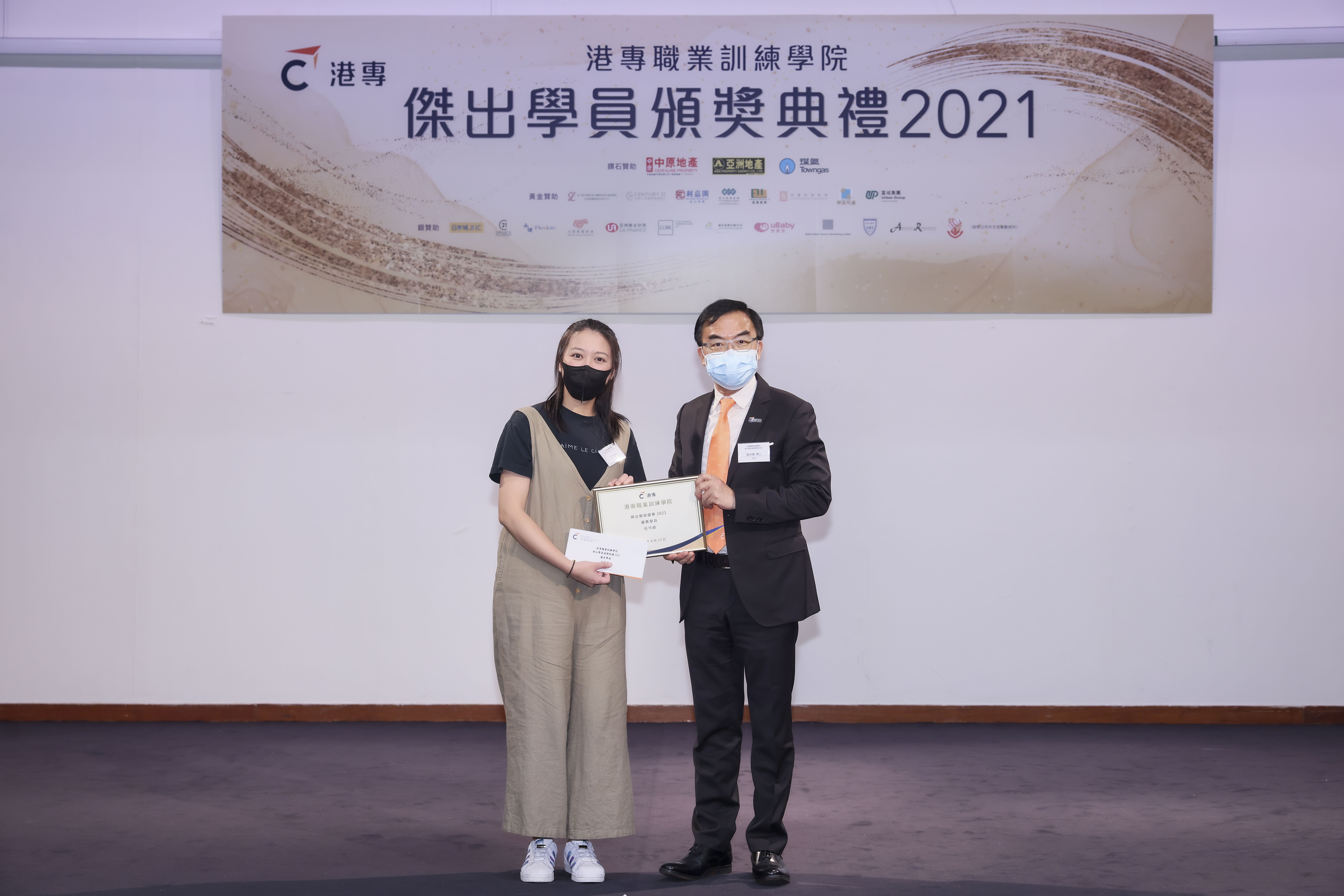 2021年度「港專職業訓練學院優異學員」伍芍錡小姐 (Winnie) 與 頒獎嘉賓 香港專業進修學校校長陳卓禧博士 合照。