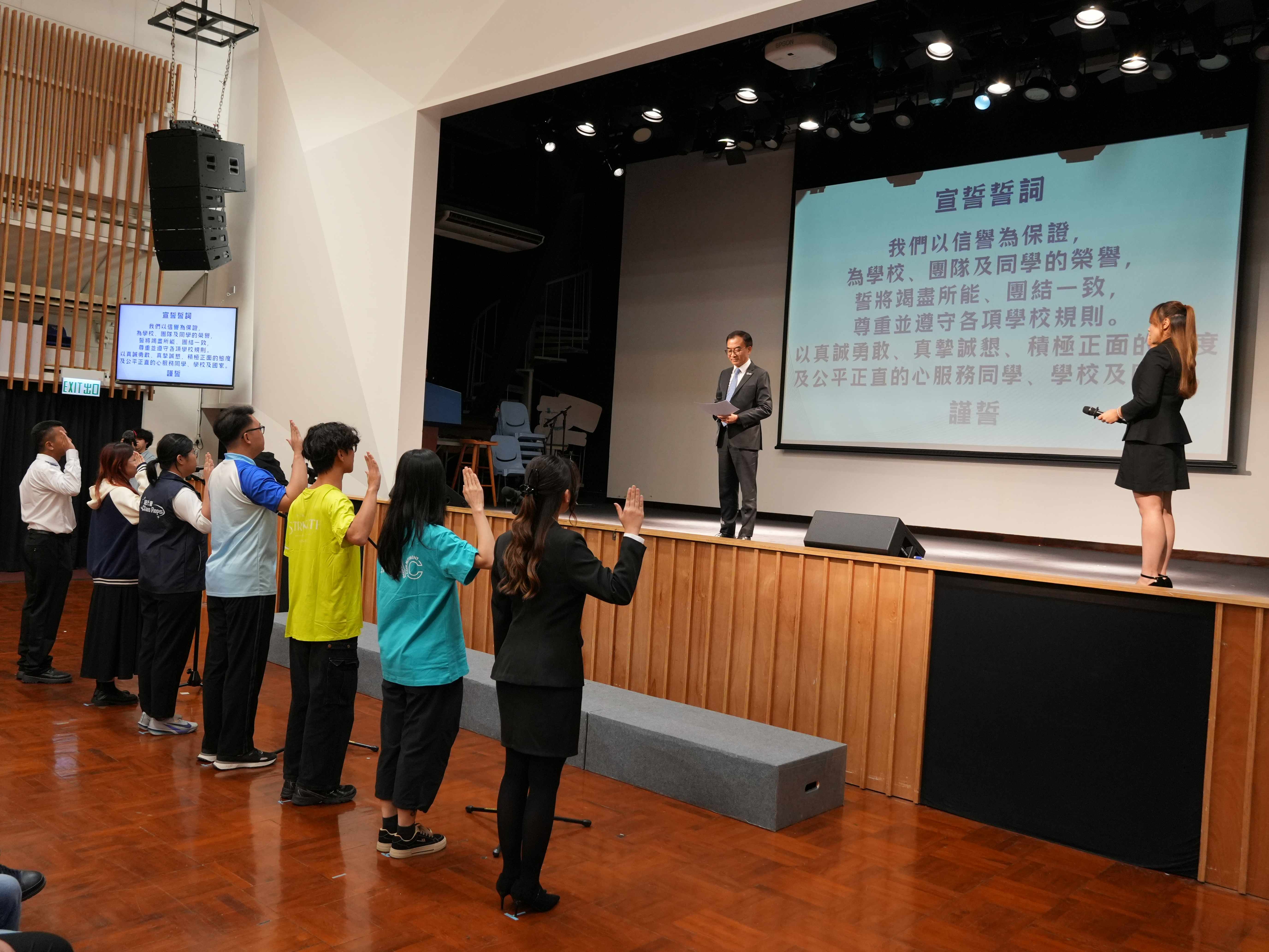 在宣誓环节,全体新任干事齐声诵读誓词:“我们以信誉为保证,为学校、团队及同学的荣誉,誓将竭尽所能、团结一致,尊重并遵守各项学校规则,以真诚勇敢、真挚诚恳、积极正面的态度及公平正直的心,服务同学、学校及国家。”誓言铿锵有力,展现青年一代的责任感与使命感。