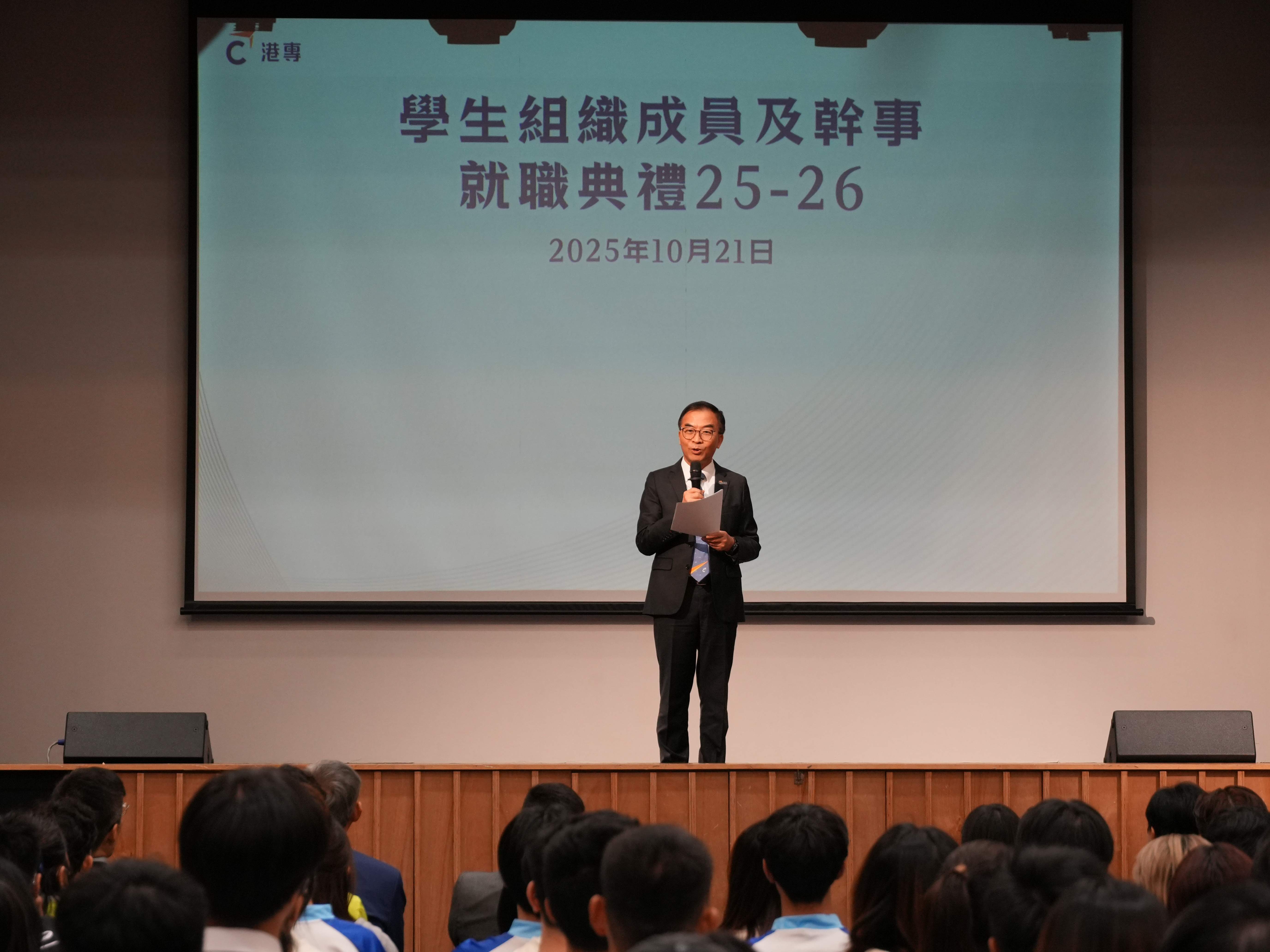 典礼由校长陈卓禧教授监誓并致辞。陈校长在致辞中表示,同学们既是各类学生活动的参与者,亦是策划者;既是实践者,亦是领导者。他透过自己在大学时期参与学生活动的经历,鼓励学生组织在活动策划中突破创意、在服务同学时倾听心声、在团队合作中互助互爱、在面对挑战时勇敢成长。