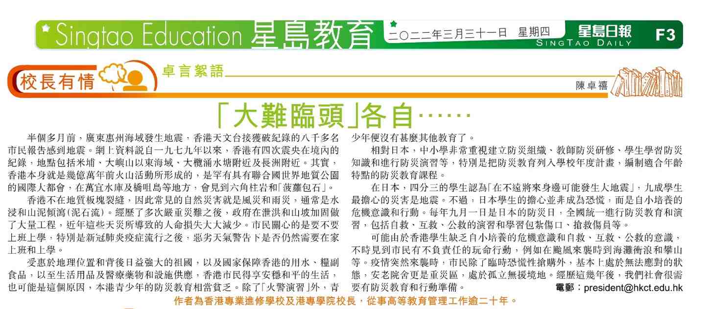 可能由于香港学生缺乏自小培养的危机意识和自救、互救、公救的意识,不时见到市民有不负责任的玩命行动,例如在台风来袭时到海滩冲浪和攀山等。疫情突然来袭时,市民除了临时恐慌性抢购外,基本上处于无法应对的状态,安老院舍更是重灾区,处于孤立无援境地。经历这几年后,我们社会很需要有防灾教育和行动准备。