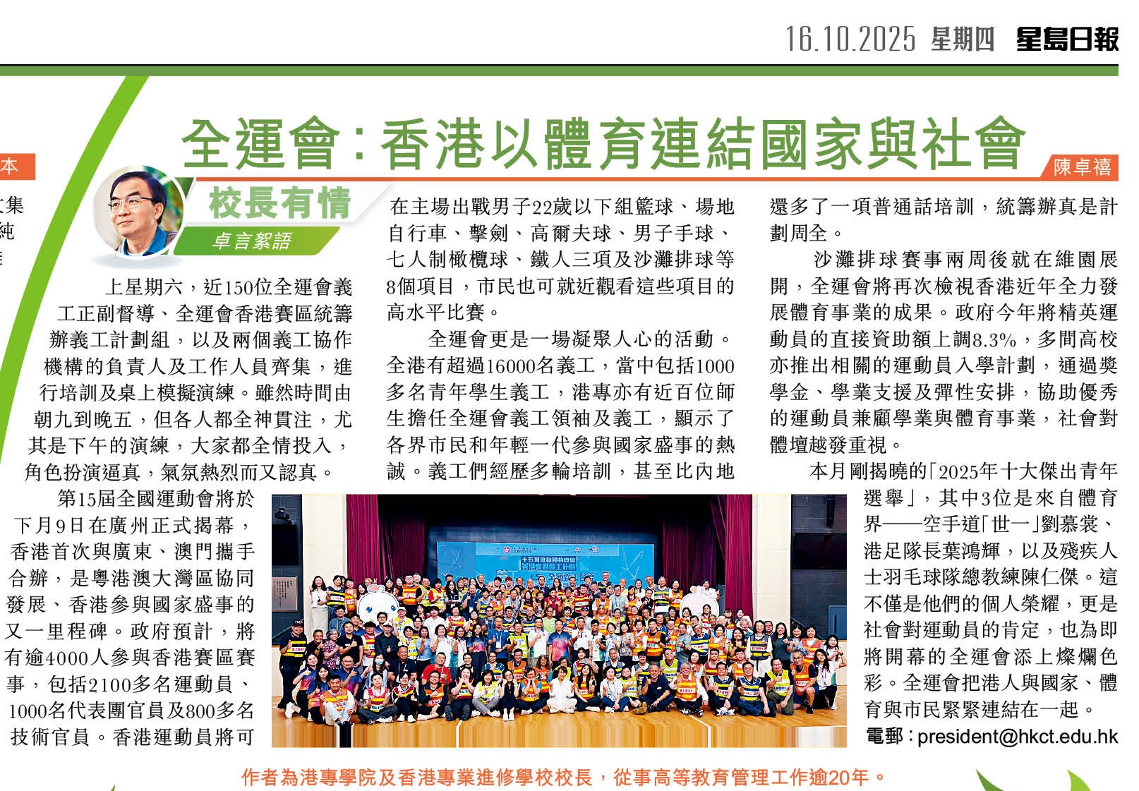 全运会更是一场凝聚人心的活动。全港有超过16,000名义工,当中包括1,000多名青年学生义工,港专亦有近百位师生担任全运会义工领袖及义工,显示了各界市民和年轻一代参与国家盛事的热诚。义工们经历多轮培训,甚至比内地还多了一项普通话培训,统筹办真是计划周全。
