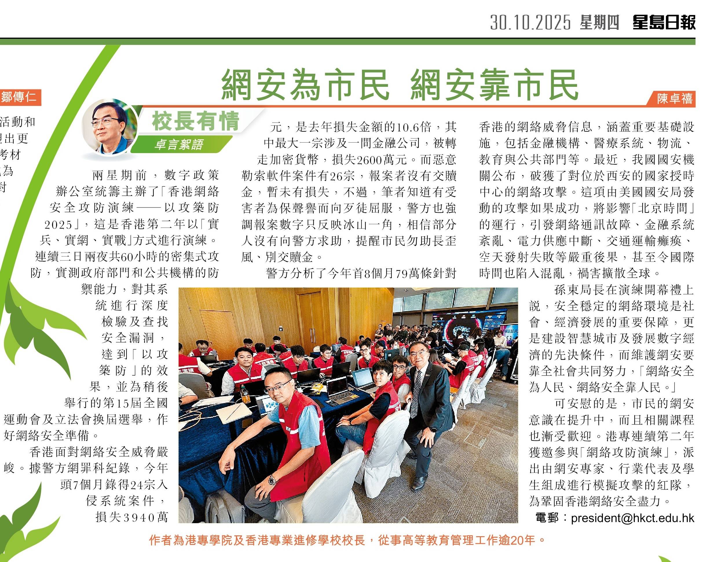 可安慰的是,市民的网安意识在提升中,而且相关课程也渐受欢迎。港专连续第二年获邀参与“网络攻防演练”,派出由网安专家、行业代表及学生组成进行模拟攻击的红队,为巩固香港网络安全尽力。