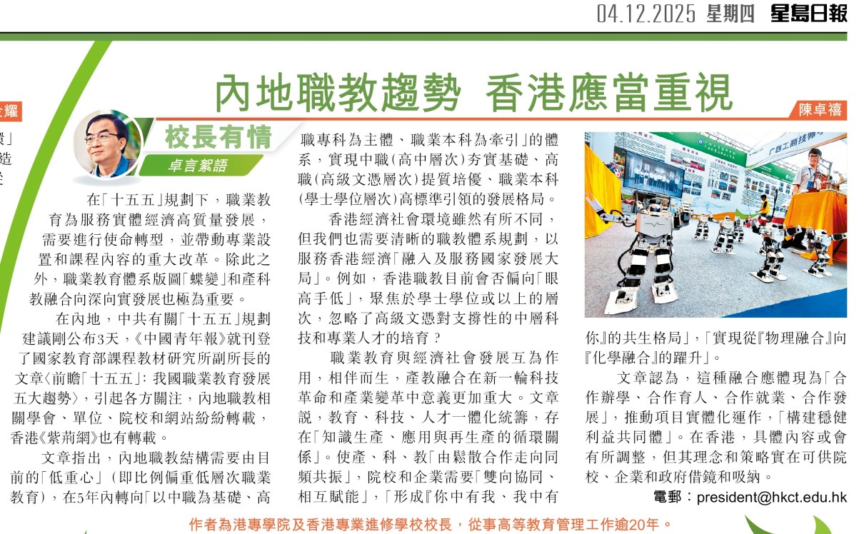在内地,中共有关“十五五”规划建议刚公布三天,《中国青年报》就刊登了国家教育部课程教材研究所副所长的文章:“前瞻‘十五五’:我国职业教育发展五大趋势”,引起各方关注,内地职教相关学会、单位、院校和网站纷纷转载,香港《紫荆网》也有转载。