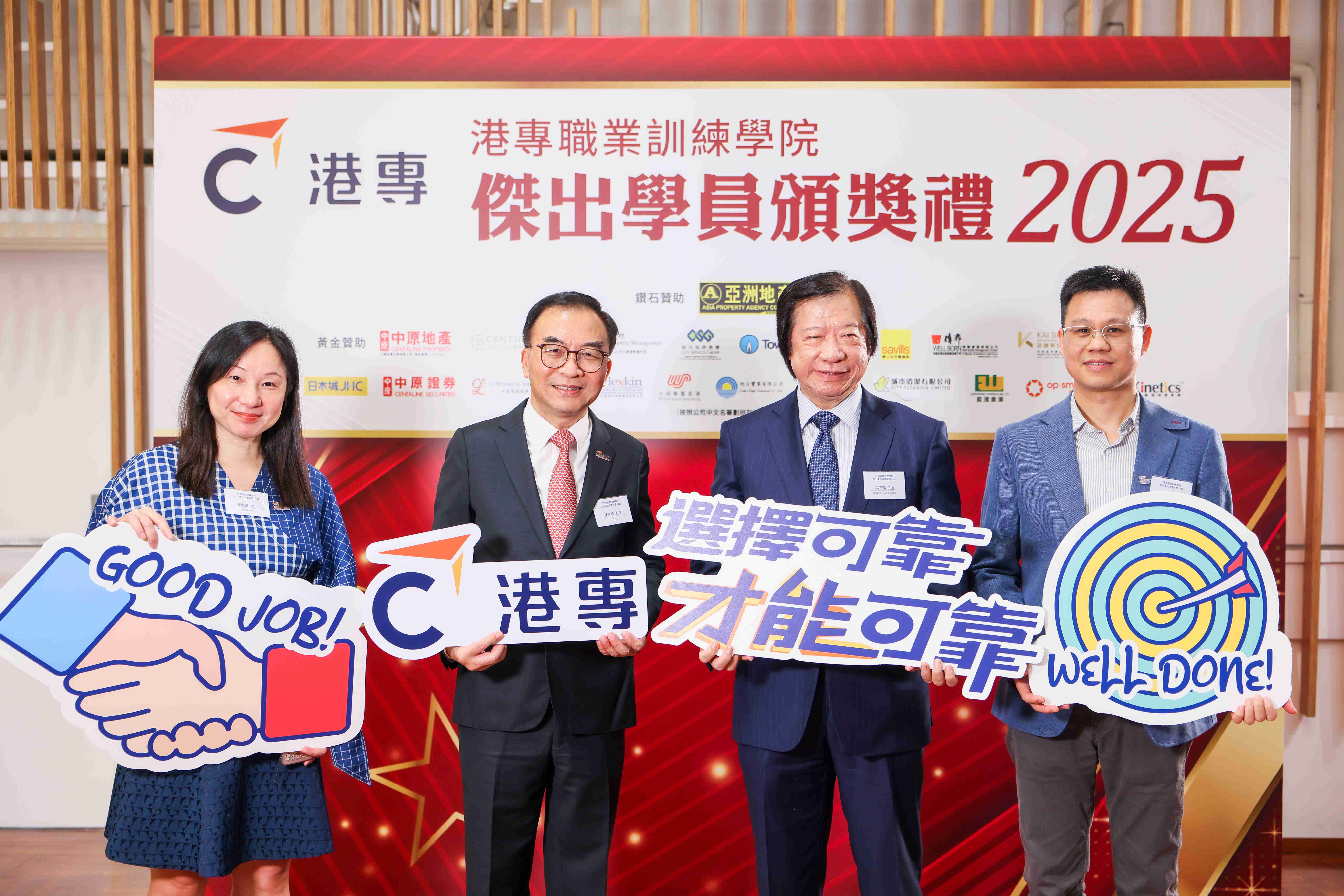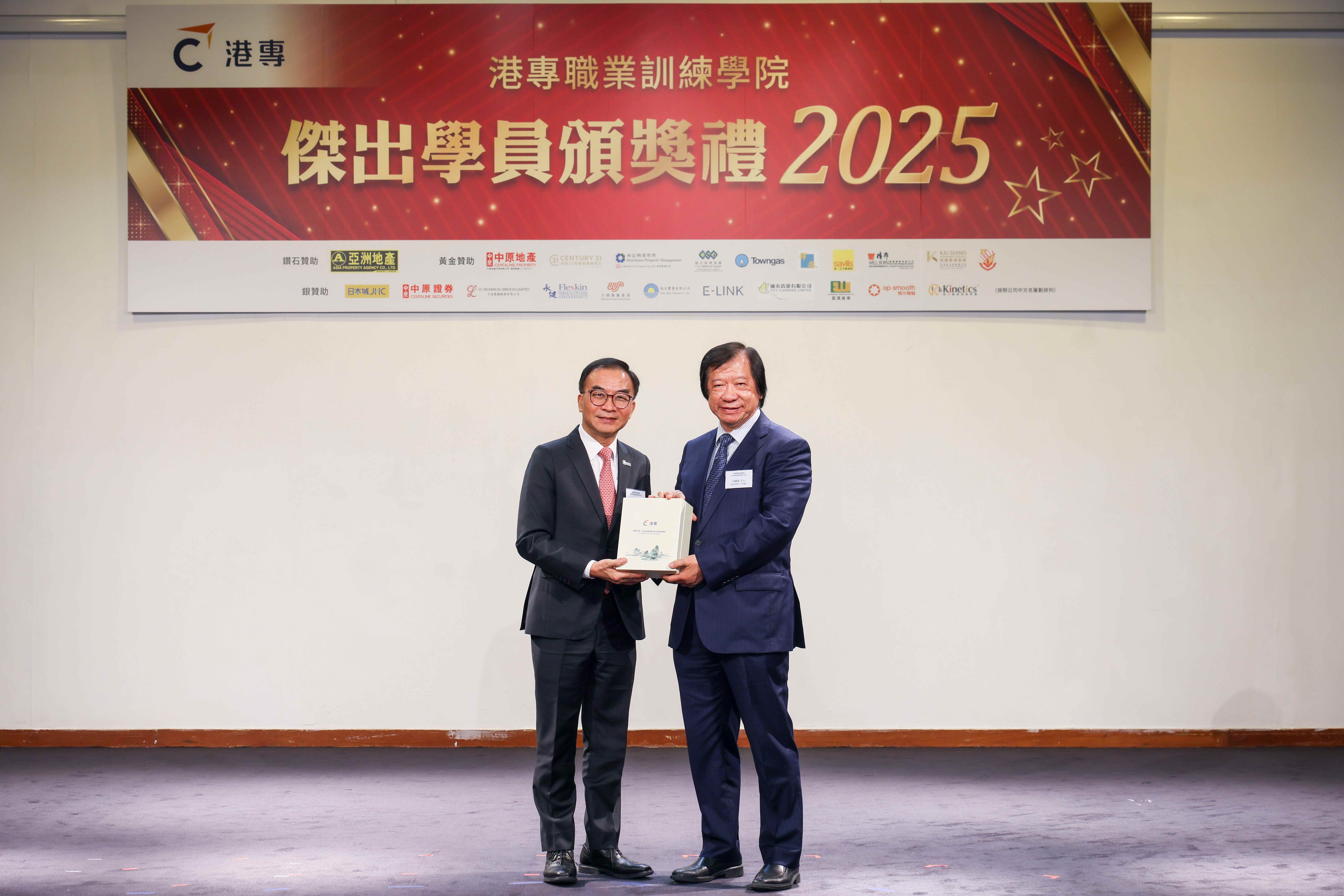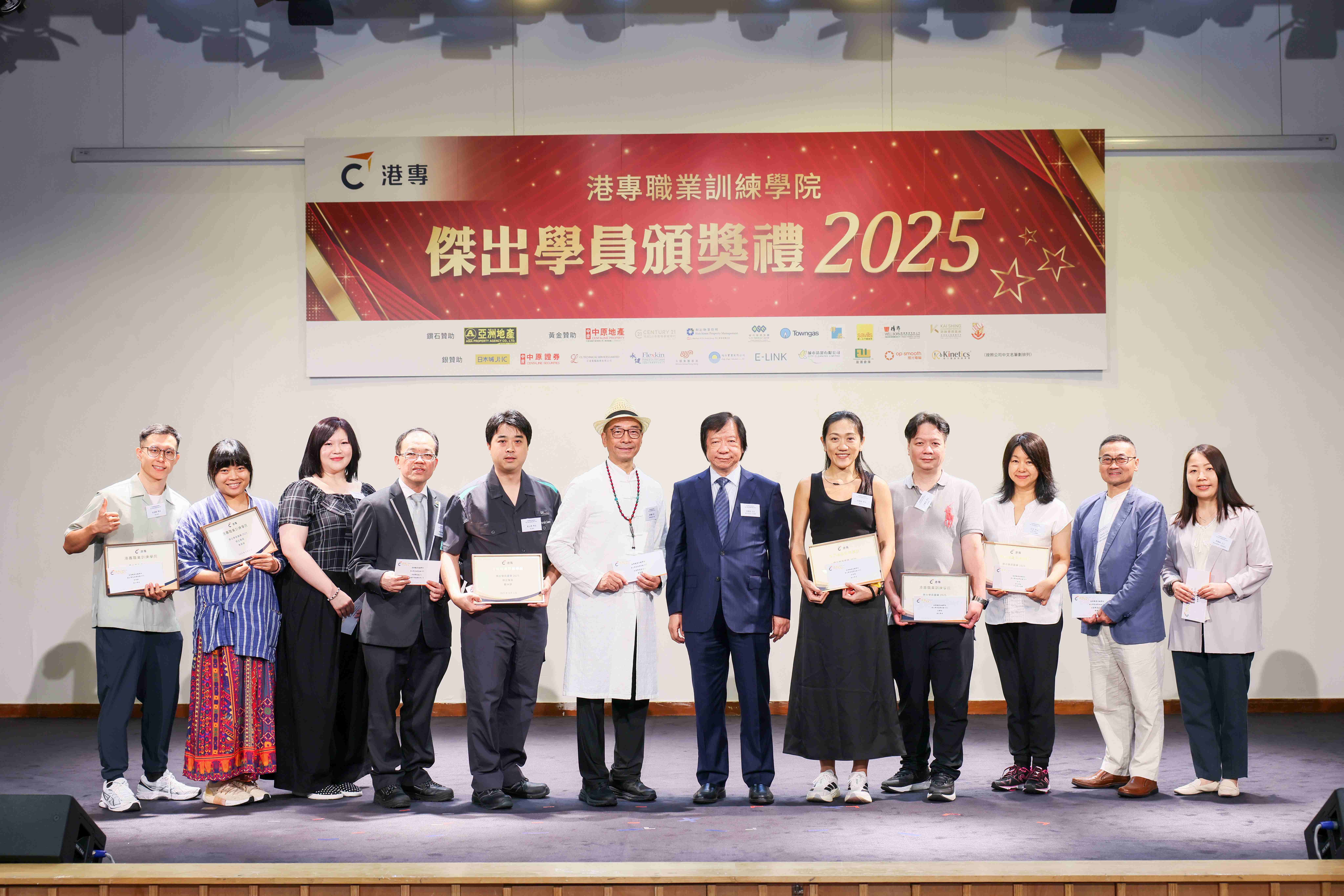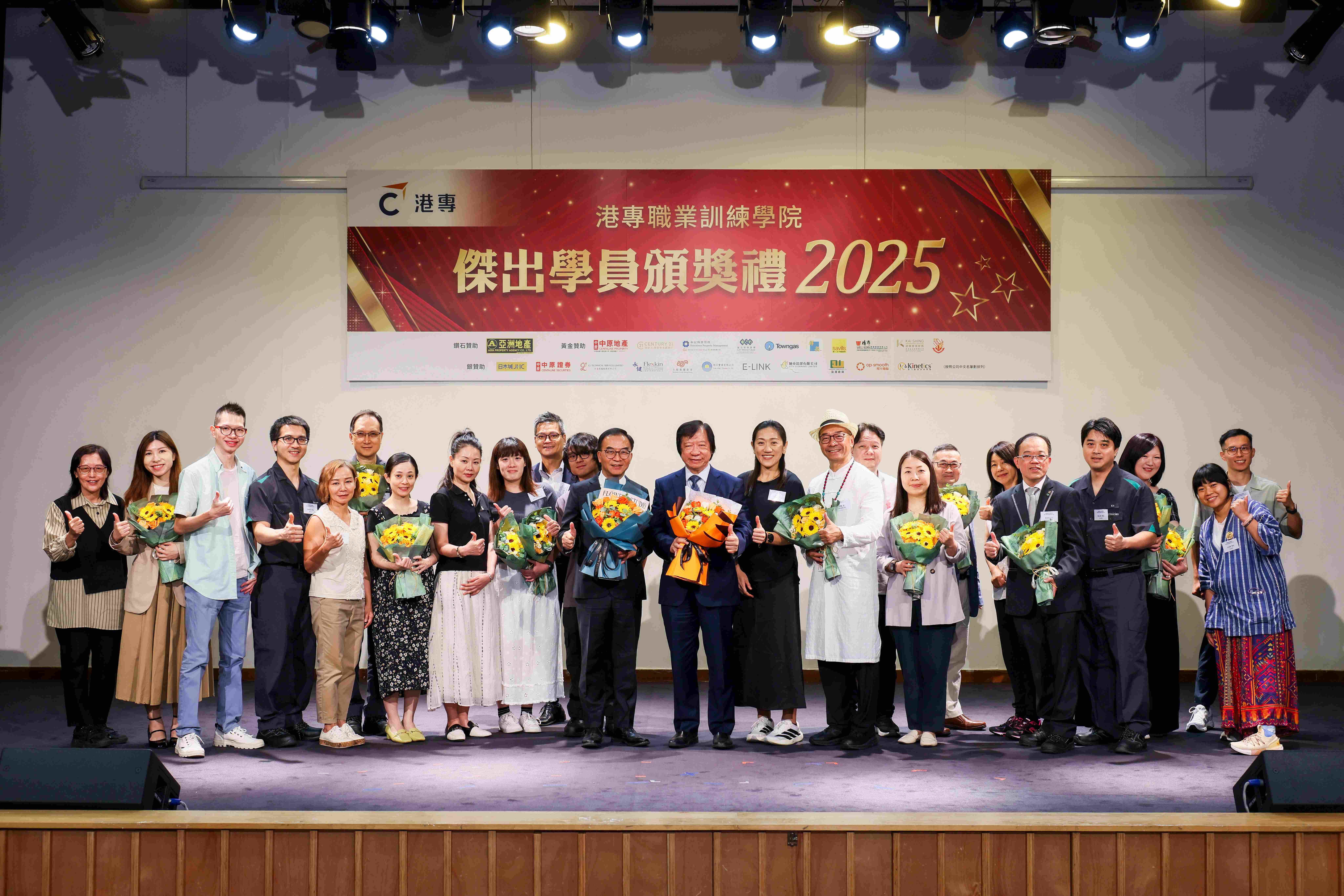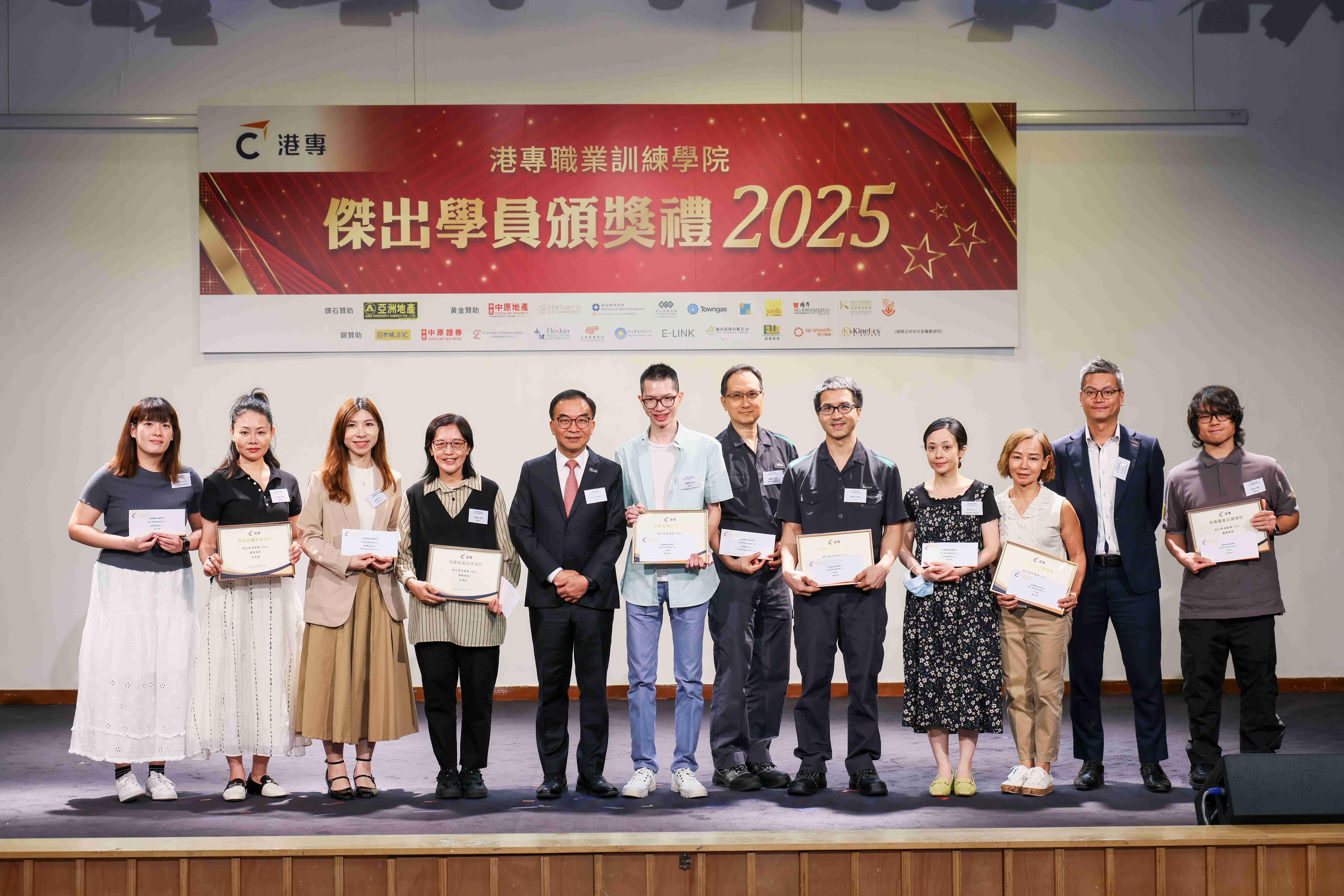 (2025年8月1日)香港专业进修学校(「港专」)职业训练学院今日假赛马会本科校园举行「杰出学员颁奖典礼2025」,由雇员再培训局行政总监吴国强先生,BBS担任主礼嘉宾,向12位具卓越表现的学员颁授奖项,当中6位凭着优秀的学习及工作表现获颁发「杰出学员奖」。面对经济结构转型与科技浪潮冲击,得奖者透过港专课程成功开拓事业新路向,更将所学转化为社会服务力量。