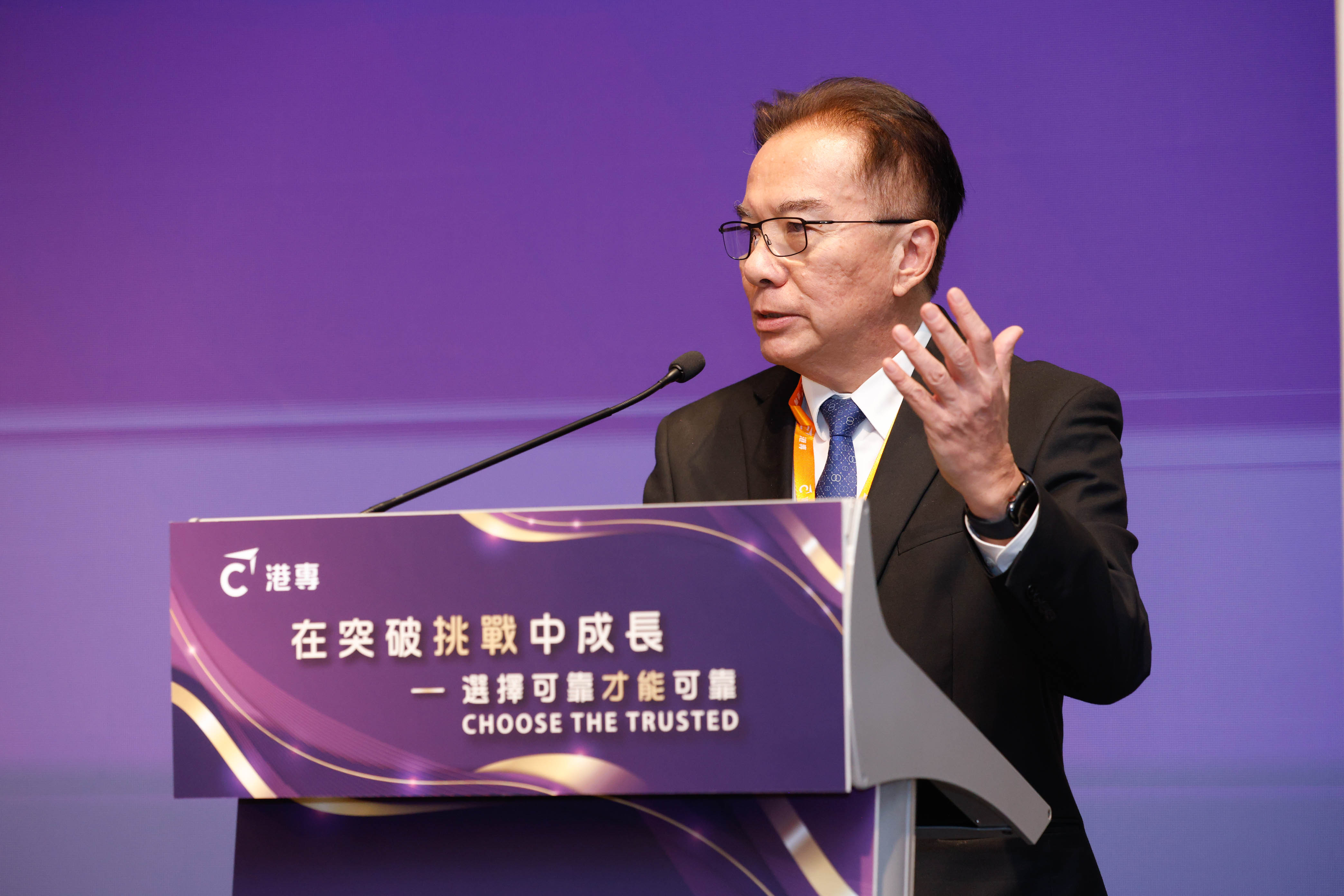 港专学院校董会主席黄友嘉博士致欢迎辞时表示,今年聚餐及年报以“在突破挑战中成长——选择可靠 才能可靠”为主题,强调港专在教育转型与制度改革的关键时期,坚守“敬业日新”的理念,以可靠实力回应社会需求。他指出,随著《专上学院条例》修订落实及特区政府推动高等教育国际化及产教融合,港专积极开拓学术领域,成功获批开办资历架构第六级硕士课程,推出包括全港首个“职涯辅导”社会科学硕士在内的两个硕士课程,展现院校的前瞻视野与社会关怀。