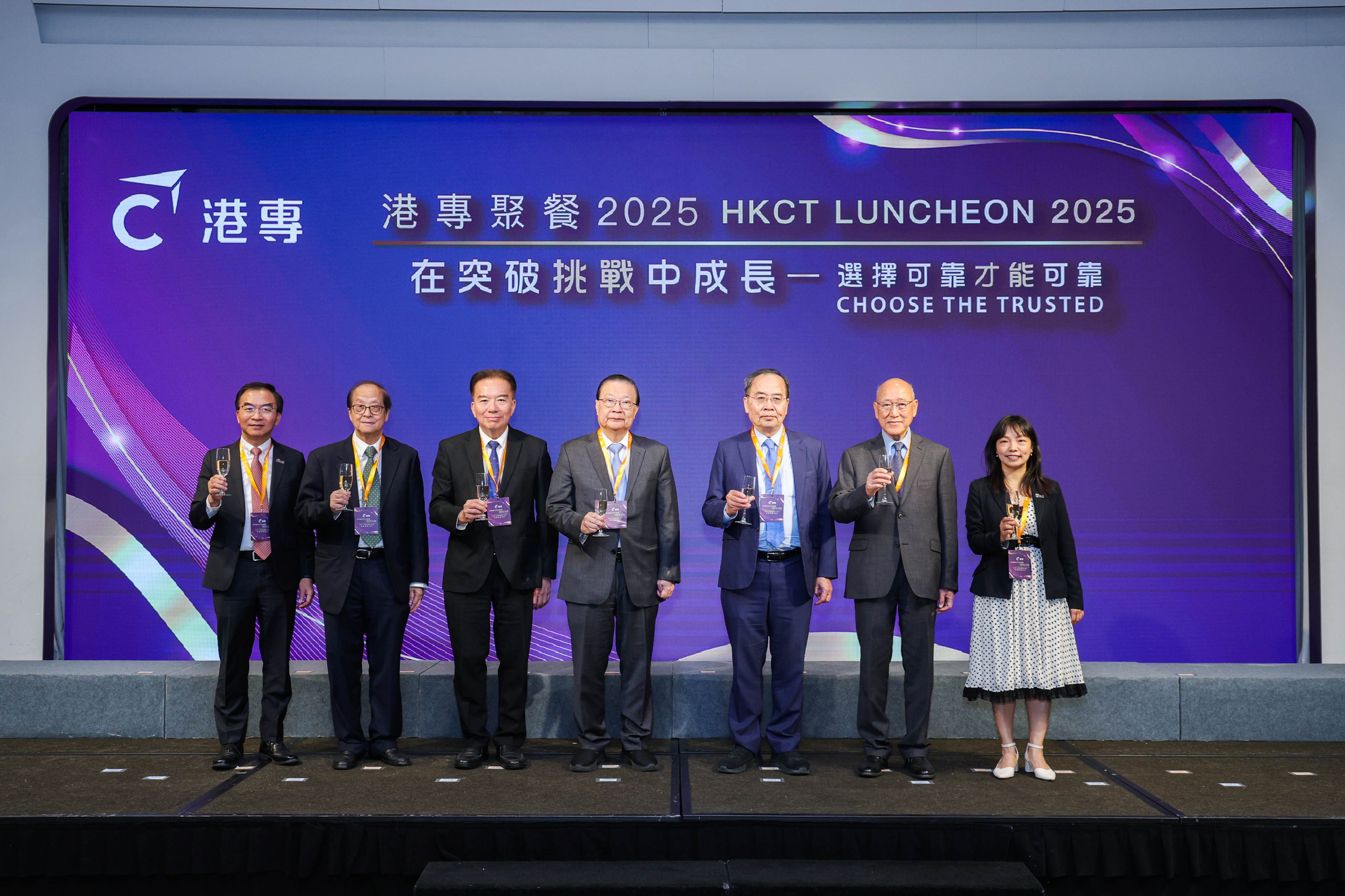 港专学院校董及香港专业进修学校校监范耀钧教授主持祝酒仪式,多位主礼嘉宾及港专管治层成员一同举杯,祝愿港专继续稳步向前,为香港及国家培育更多专业人才。