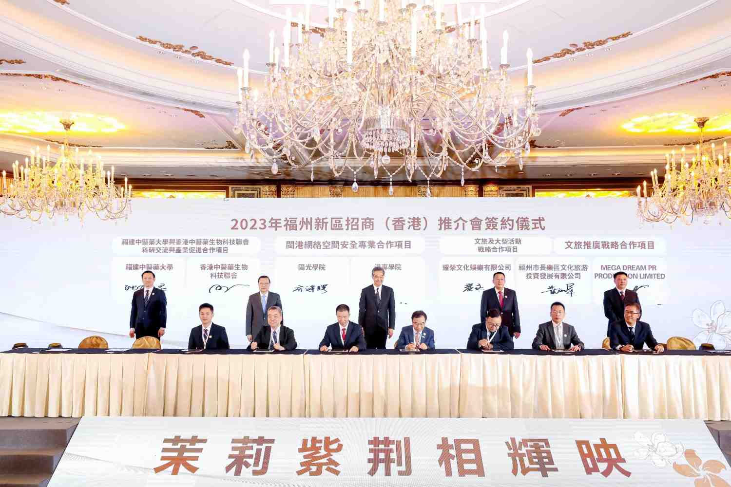 福州新區招商(香港)推介會合共簽署15個合作項目,圍繞閩港雙方的數字經濟、金融、基建、貿易、文旅與教育等範籌,其中教育方面,香港港專學院校長陳卓禧與褔州陽光學院校長喬海曙簽署網絡安全專業共建項目。