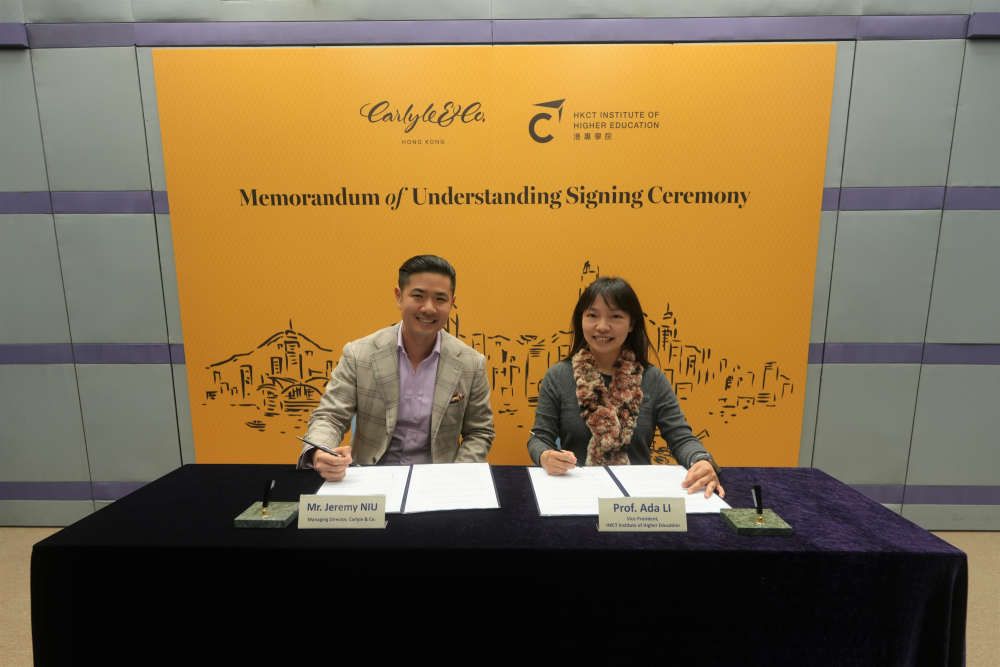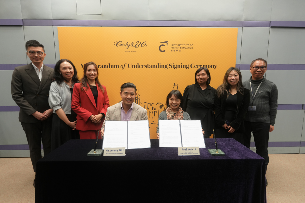 在人才培訓方面,Carlyle & Co. Hong Kong 將考慮為港專學生提供多元化學習及實踐機會。港專亦會推薦學生參與 Carlyle & Co. Hong Kong 的企業社會責任項目,讓學生在服務社會的同時,培養專業態度。