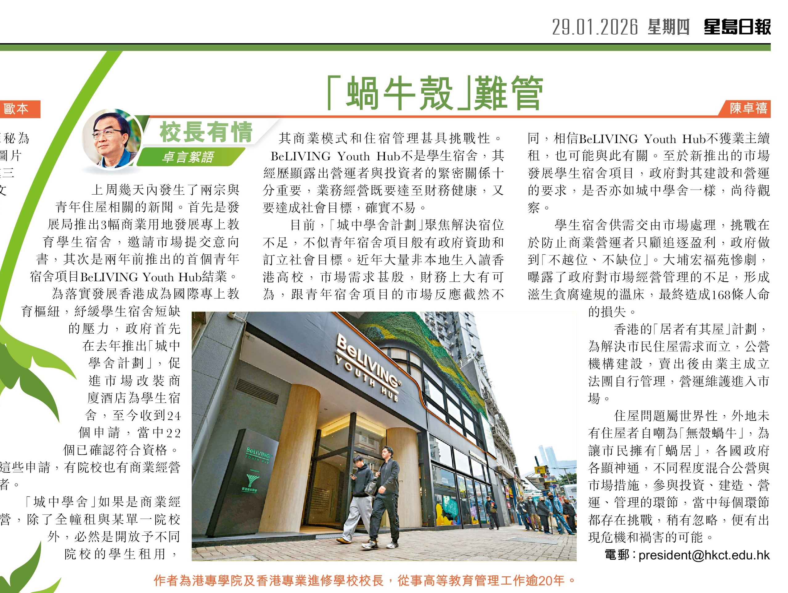 「城中學舍」如果是商業經營,除了全幢租與某單一院校外,必然是開放予不同院校的學生租用,其商業模式和住宿管理甚具挑戰性。BeLIVING Youth Hub不是學生宿舍,其經歷顯露出營運者與投資者的緊密關係十分重要,業務經營既要達至財務健康,又要達成社會目標確實不易。