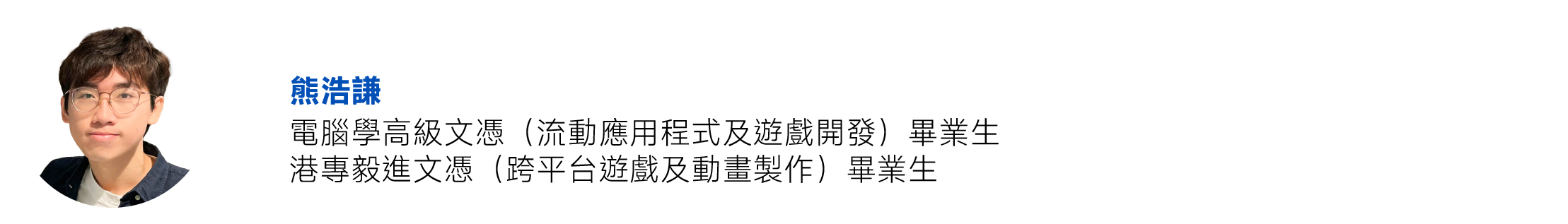 「此課程涵蓋內容廣泛,並緊貼最新科技發展,讓我們可以掌握業界最新技術。學校師資優良,導師們在課餘時間亦會提供專業指導, 樂於與我們交流,並鼓勵我們不斷創新。這啟發我進行手機遊戲及流動應用程式創作,與大家分享創作成果。」